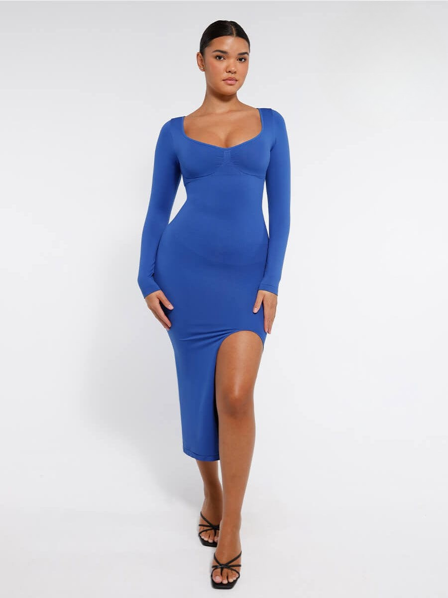 העיצוב כולל שסע קדמי גבוה ליצירת מראה לביש ואלגנטי, בטכנולוגיית סריגה חלקה שמחזקת את האזורים המחטבים ותומכת בגוף כמוצר מחטב ולא כשמלה רגילה.