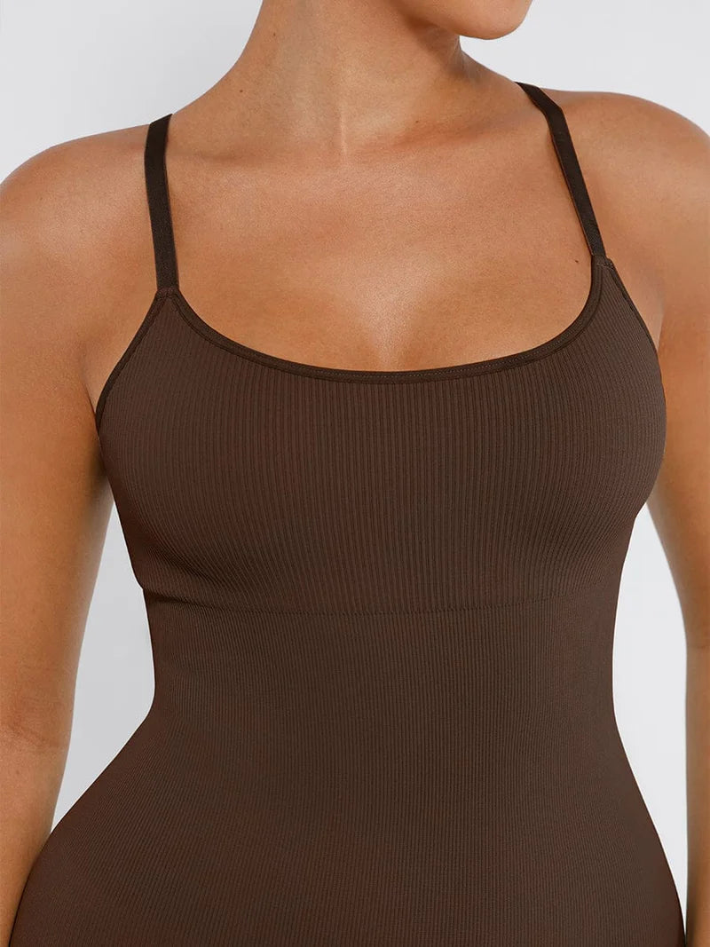 אוברול מחטב Sienna בנוי כיחידה אחת בגזרה צמודה עם כתפיות דקות ומתכווננות, ומשלב בד אלסטי חלק עם טקסטורת ריב עדינה שמחטבת את הגוף ומדגישה קימורים בצורה טבעית.